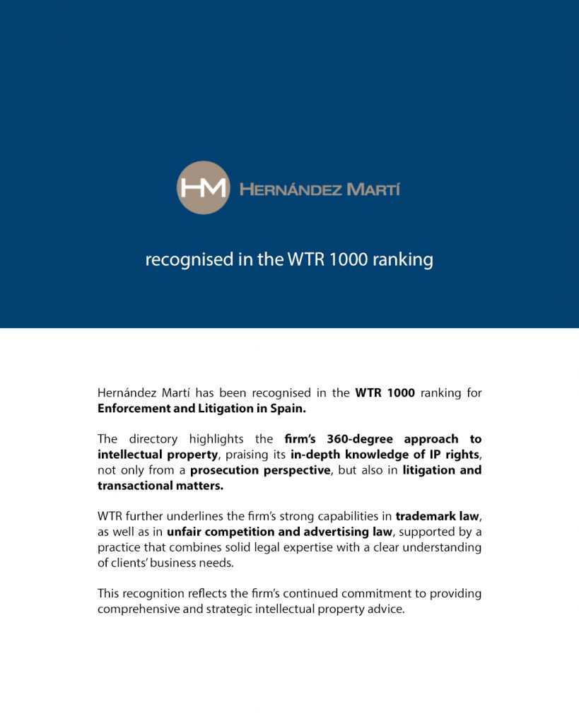 Hernández Martí has been recognised in the WTR 1000 ranking for Enforcement and Litigation in Spain.